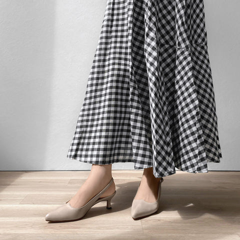 1cm毎に3段階調整可能なバックストラップが足をホールドしてくれるパンプス。ハート型にカットされた甲ラインが女性らしく美しい、使い勝手の良い一足。