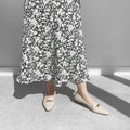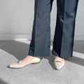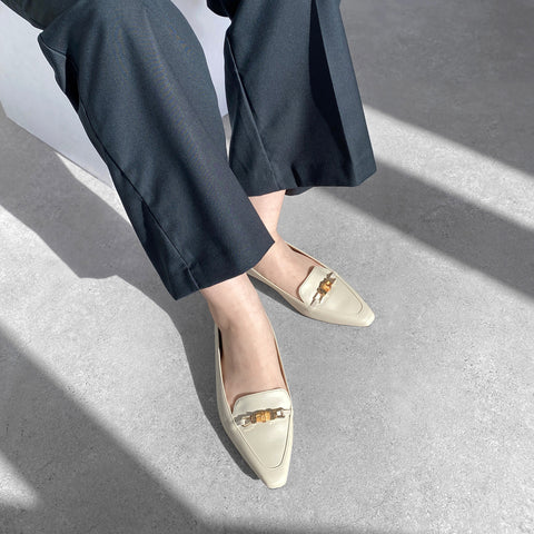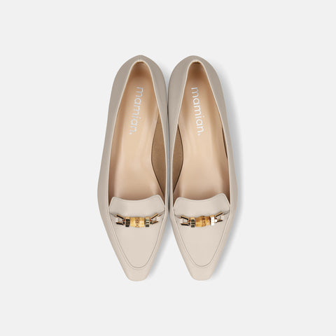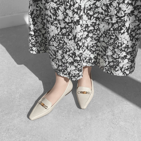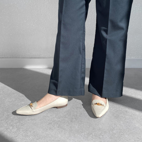 スラリと長めのノーズ(つま先)、足の甲を覆うローファーデザインとバンブービットがスタイリッシュなフラットシューズ。シャープなスクエアトゥで履きやすさ、使いやすさを重視しました。