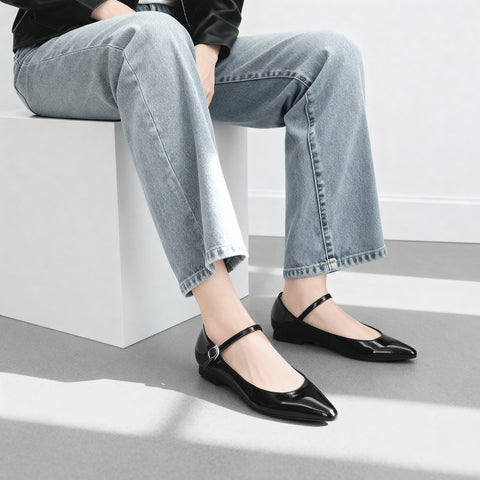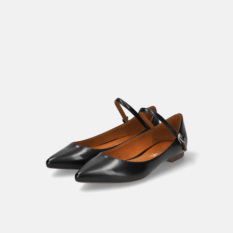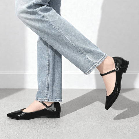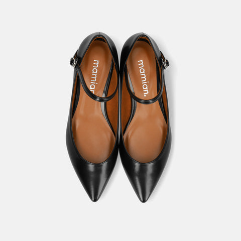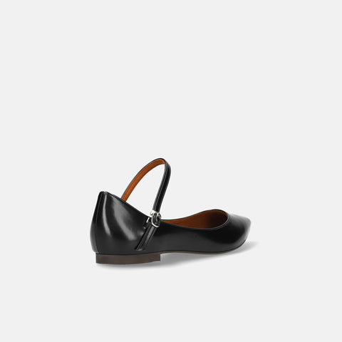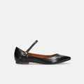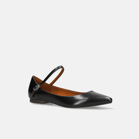 甲の高い位置(足首と甲の中間)にくるよう施されたストラップが新鮮な印象のポインテッドトゥフラットシューズ。華奢なストラップと浅めの甲カッティングが足を綺麗に見せてくれます。