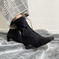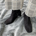 編み上げ(レースアップ)とワイドなつま先(スクエアトゥ)がトレンド感抜群の5.5cmヒールショートブーツ。