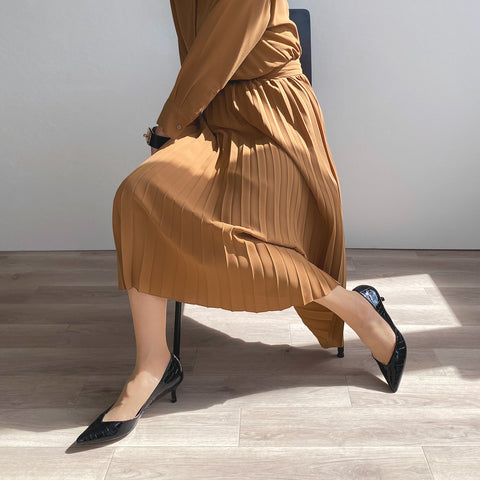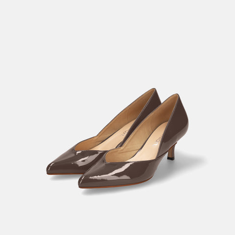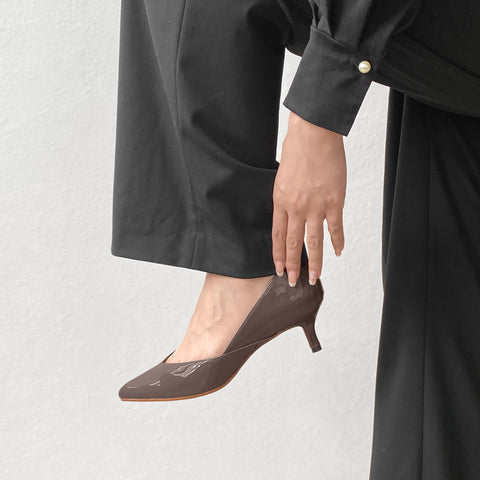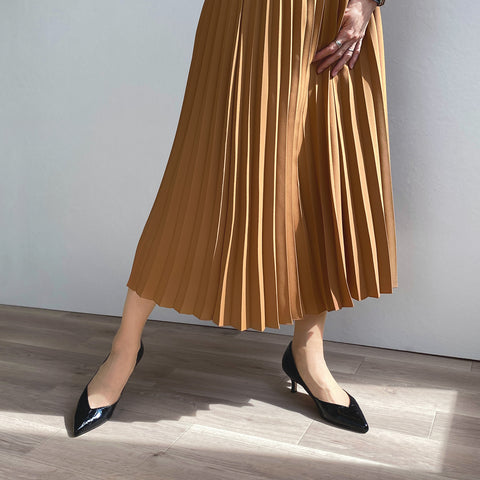 赤みが強く、コーラルピンクに近いカラー。足元に血色をプラスしつつ、ベージュだから使いやすさも抜群。とろけるようジェルファンデーションをイメージした、つやつや華やかなエナメル素材。