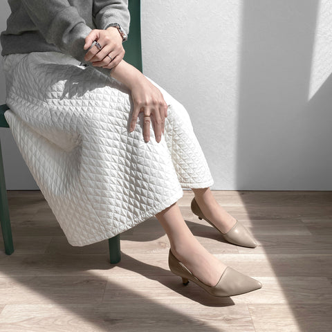 足が美しく見えるよう、サイドをぐっと浅く仕立てたデザインパンプス。4.5cmの低めヒールでも足がきれいに見える工夫が詰まったシンプルな一足です。