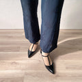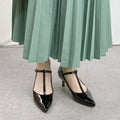 デイリーに使いやすい5cmヒールのTストラップパンプスが登場。低めヒールながらポインテッドトゥが足元をシャープで綺麗に見せてくれる、優秀な一足です。